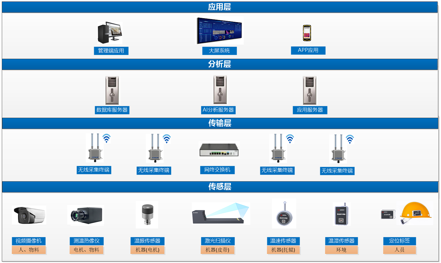 本解決方案針對(duì)當(dāng)下皮帶輸送裝置巡檢存在的痛點(diǎn),重點(diǎn)研發(fā)了面向皮帶撕裂和損傷檢測(cè)的激光掃描儀、用于托輥/滾筒狀態(tài)監(jiān)測(cè)的無(wú)線(xiàn)低功耗溫速傳感器、用于環(huán)境狀態(tài)監(jiān)測(cè)的無(wú)線(xiàn)低功耗溫濕傳感器、用于電機(jī)及減速機(jī)狀態(tài)監(jiān)測(cè)的無(wú)線(xiàn)低功耗溫振傳感器、用于人員定位的無(wú)線(xiàn)低功耗位置傳感器,并集成成熟的視頻攝像機(jī)、測(cè)溫?zé)嵯駜x,形成溫度、振動(dòng)、速度、圖像、視頻、位置六大在線(xiàn)感知技術(shù)融合,從而實(shí)現(xiàn)對(duì)皮帶輸送裝置安全生產(chǎn)四要素“人機(jī)料環(huán)”全面快速感知,并利用大數(shù)據(jù)、AI等技術(shù)實(shí)現(xiàn)皮帶輸送裝置全面狀態(tài)的實(shí)時(shí)監(jiān)測(cè)、多維分析及超前超警,從而保障皮帶輸送裝置高效安全運(yùn)行。